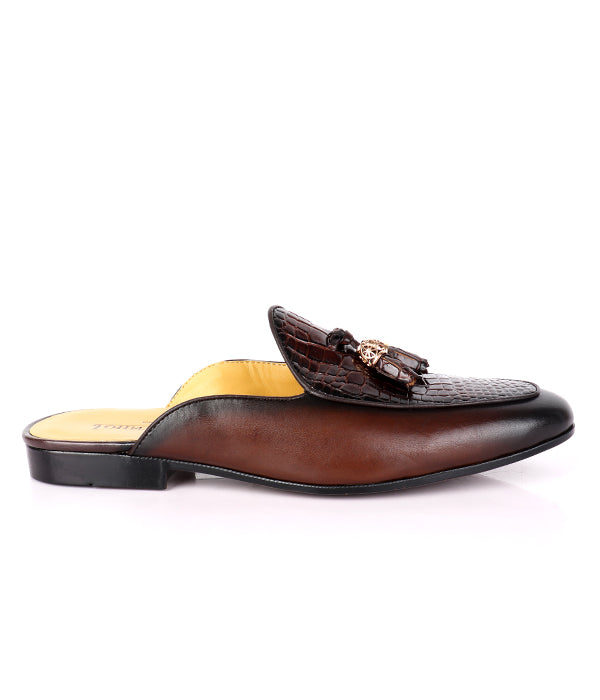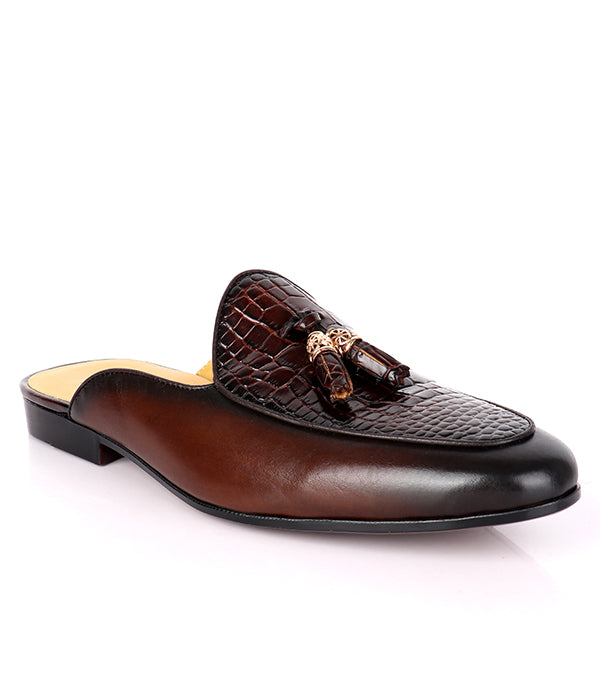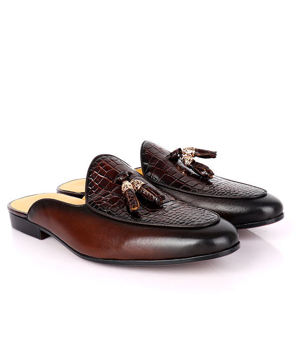 John Foster Croc Design Leather Tassel Men's Mules|Brown