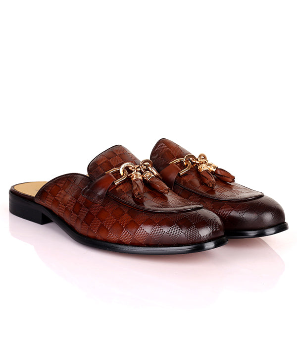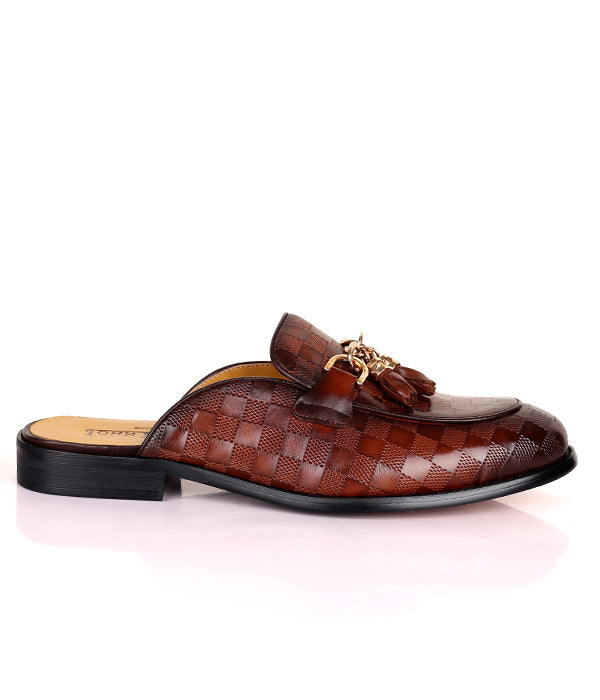 John Foster Square Pattern Tassel Horsebit Mules|Brown
